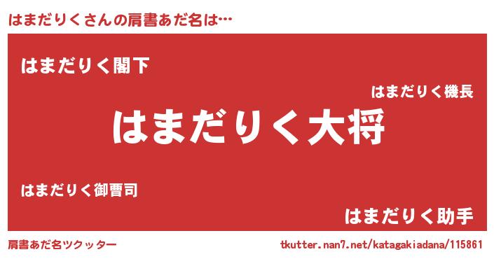 | 男性向けラノベタイトル風あだ名 | 『はまだりく~年齢イコール彼女いない歴の魔法使い~』 |