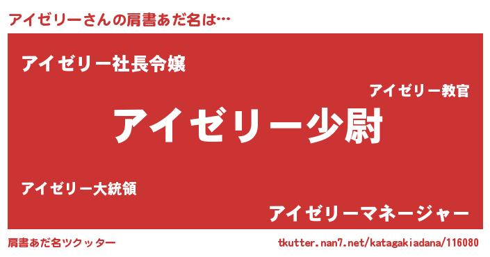 | 男性向けラノベタイトル風あだ名 | 『アイゼリー~年齢イコール彼女いない歴の魔法使い~』 |