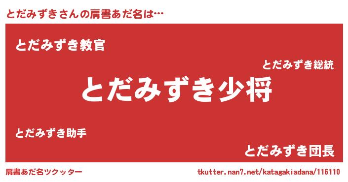 | 男性向けラノベタイトル風あだ名 | 『とだみずき~年齢イコール彼女いない歴の魔法使い~』 |