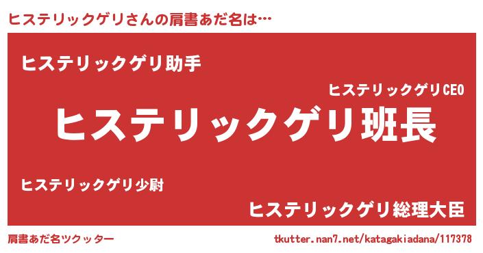 | 男性向けラノベタイトル風あだ名 | 『ダンジョンにヒステリックゲリを求めるのは間違っているだろうか』 |