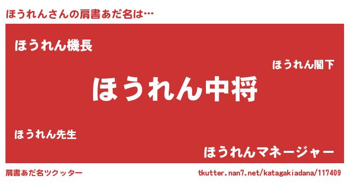 | 男性向けラノベタイトル風あだ名 | 『ほうれん~年齢イコール彼女いない歴の魔法使い~』 |