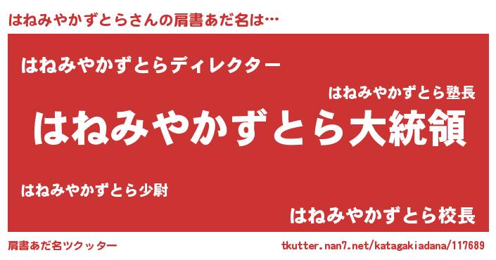 | 男性向けラノベタイトル風あだ名 | 『やはりはねみやかずとらの青春ラブコメはまちがっている 』 |