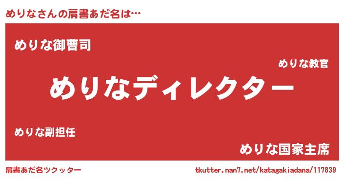 | 男性向けラノベタイトル風あだ名 | 『はたらくめりなさま!』『めりなの憂鬱』 |
