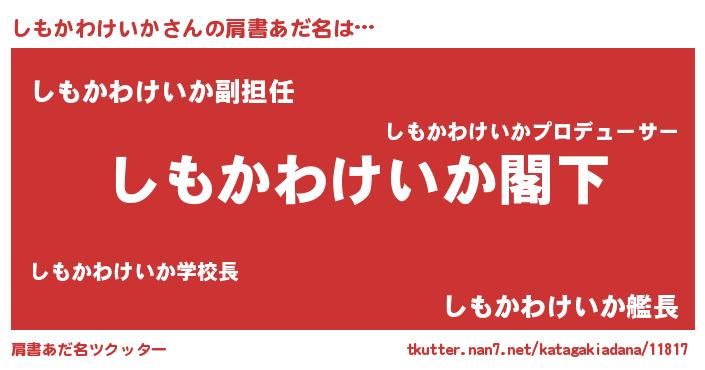 | 意味不明あだ名 | 『自称しもかわけいか』 |