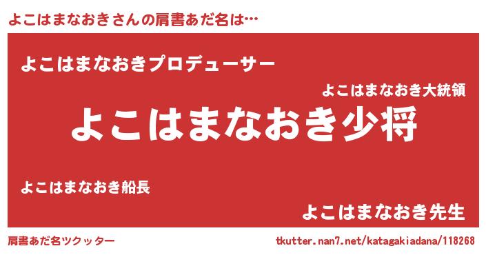 | 男性向けラノベタイトル風あだ名 | 『よこはまなおき~年齢イコール彼女いない歴の魔法使い~』 |