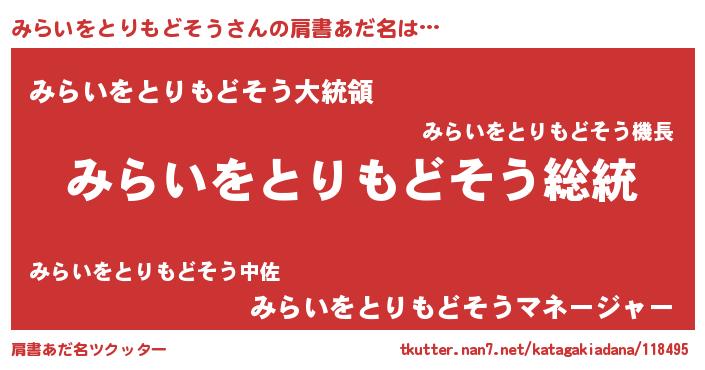 | 男性向けラノベタイトル風あだ名 | 『Re:みらいをとりもどそうから始める異世界生活』 |