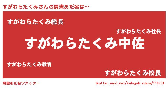| 男性向けラノベタイトル風あだ名 | 『転生したらすがわらたくみだった件』 |