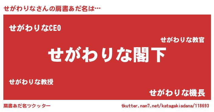 | 男性向けラノベタイトル風あだ名 | 『Re:せがわりなから始める異世界生活』 |