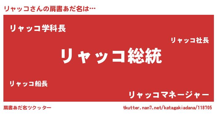 | 男性向けラノベタイトル風あだ名 | 『Re:リャッコから始める異世界生活』 |