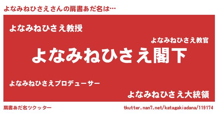 | 男性向けラノベタイトル風あだ名 | 『Re:よなみねひさえから始める異世界生活』 |