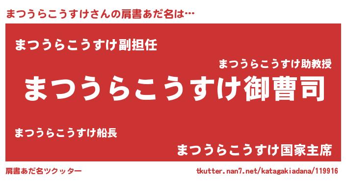 | 女子向けラノベタイトル風あだ名 | 『誰かこのまつうらこうすけを説明してください! ~契約から始まるウェディング~』 |