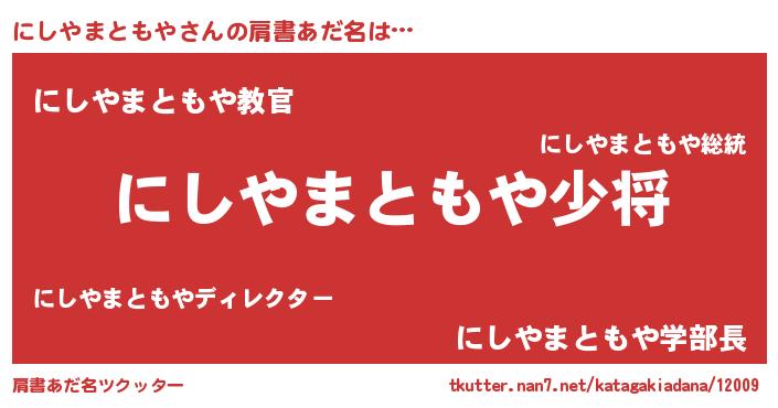 | 女子向けラノベタイトル風あだ名 | 『にしやまともやの玉の輿計画!』 |