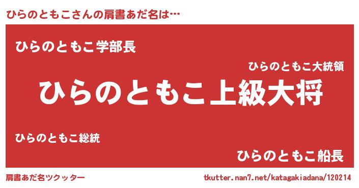 | 女子向けラノベタイトル風あだ名 | 『ひらのともこの玉の輿計画!』 |