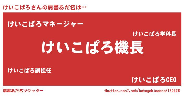 | 男性向けラノベタイトル風あだ名 | 『うちのけいこぱろが世界を掌握している!』 |
