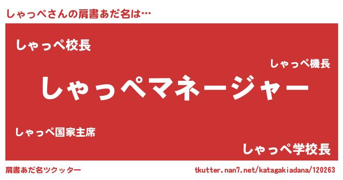 | 男性向けラノベタイトル風あだ名 | 『しゃっぺに滅ぼされるだけの簡単なお仕事です』 |