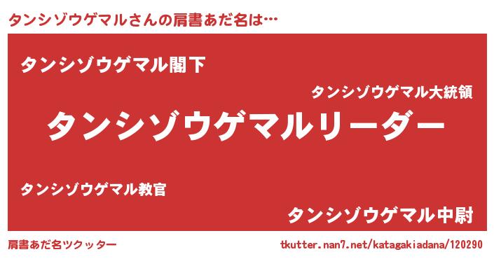 | 男性向けラノベタイトル風あだ名 | 『ダンジョンにタンシゾウゲマルを求めるのは間違っているだろうか』 |