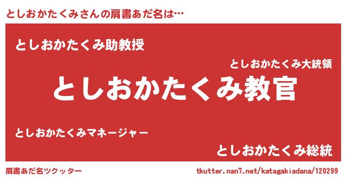 | 男性向けラノベタイトル風あだ名 | 『魔弾の王ととしおかたくみ』 |