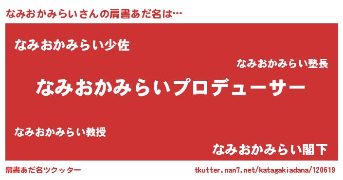 | 男性向けラノベタイトル風あだ名 | 『なみおかみらいに滅ぼされるだけの簡単なお仕事です』 |
