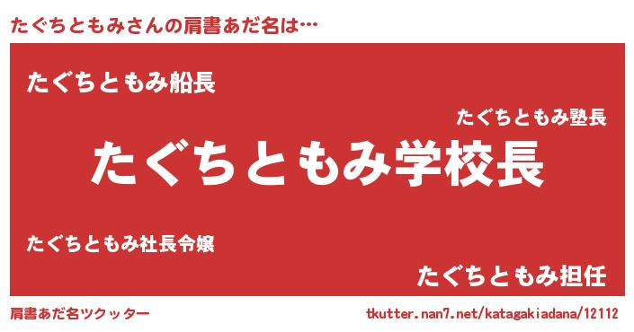 | 男性向けラノベタイトル風あだ名 | 『おまえをオタクにしてやるから、俺をたぐちともみにしてくれ! 』 |