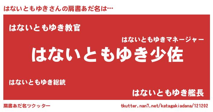 | 男性向けラノベタイトル風あだ名 | 『はないともゆき~年齢イコール彼女いない歴の魔法使い~』 |