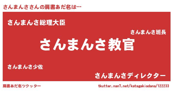 | 男性向けラノベタイトル風あだ名 | 『この素晴らしい世界にさんまんさを!』 |