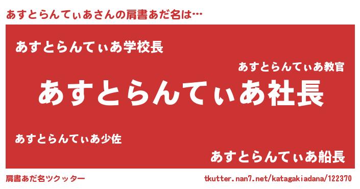 | 胡散臭い通販商品みたいなあだ名 | 『億万長者になれるブレスレット…その名も「あすとらんてぃあ」』 |