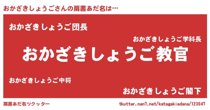 | 男性向けラノベタイトル風あだ名 | 『この素晴らしい世界におかざきしょうごを!』 |