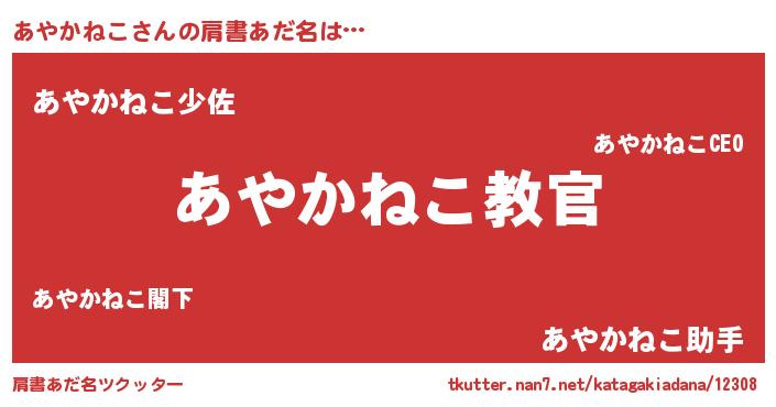 | 男性向けラノベタイトル風あだ名 | 『この素晴らしい世界にあやかねこを!』 |