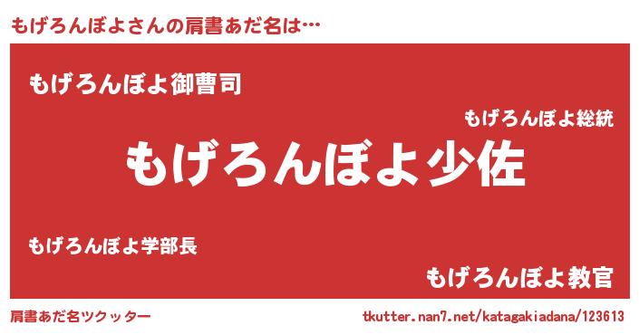 | 男性向けラノベタイトル風あだ名 | 『もげろんぼよ~年齢イコール彼女いない歴の魔法使い~』 |