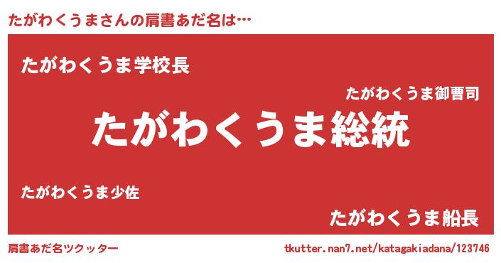 | 男性向けラノベタイトル風あだ名 | 『Re:たがわくうまから始める異世界生活』 |