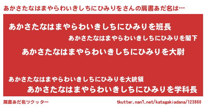 | 男性向けラノベタイトル風あだ名 | 『あかさたなはまやらわいきしちにひみりを~年齢イコール彼女いない歴の魔法使い~』 |