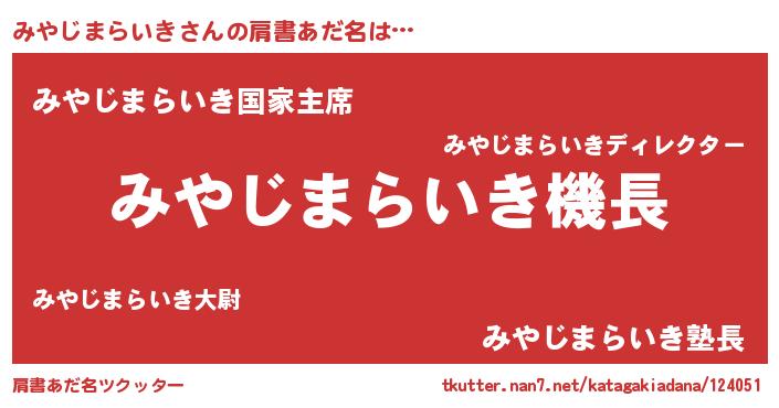 | 男性向けラノベタイトル風あだ名 | 『うちのみやじまらいきが世界を掌握している!』 |
