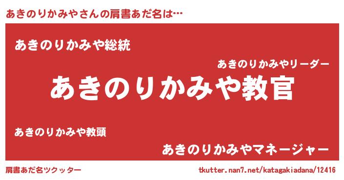 | 男性向けラノベタイトル風あだ名 | 『この素晴らしい世界にあきのりかみやを!』 |