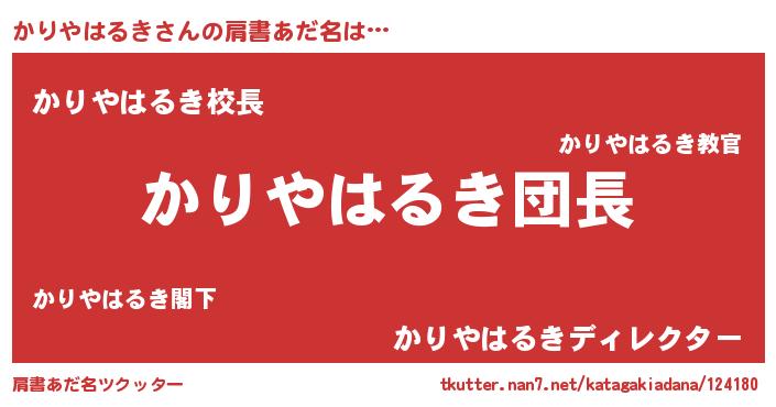 | 男性向けラノベタイトル風あだ名 | 『かりやはるきの嫁は女の子じゃないと思った?』 |