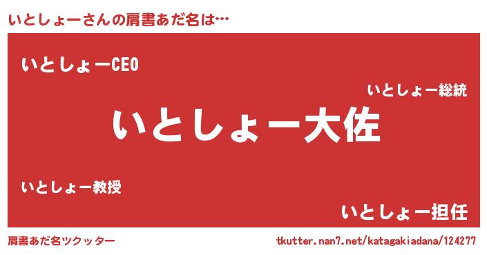 | 男性向けラノベタイトル風あだ名 | 『いとしょー~年齢イコール彼女いない歴の魔法使い~』 |