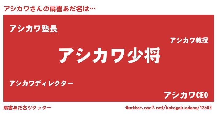 | 男性向けラノベタイトル風あだ名 | 『アシカワ~年齢イコール彼女いない歴の魔法使い~』 |