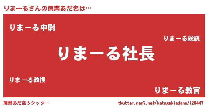 | 男性向けラノベタイトル風あだ名 | 『りまーるの憂鬱』『リマールスレイヤー』 |