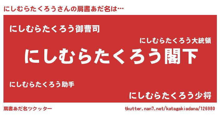 | 意味不明あだ名 | 『自称にしむらたくろう』 |