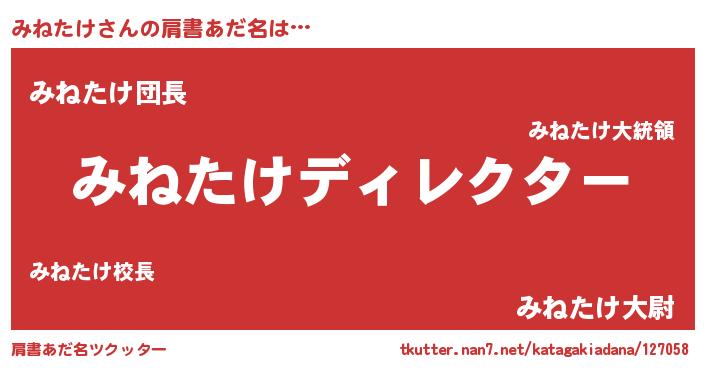 | 男性向けラノベタイトル風あだ名 | 『みねたけに滅ぼされるだけの簡単なお仕事です』 |