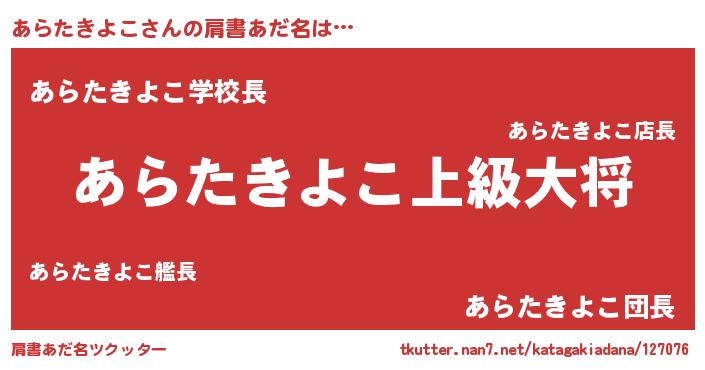| 男性向けラノベタイトル風あだ名 | 『あらたきよこ~年齢イコール彼女いない歴の魔法使い~』 |