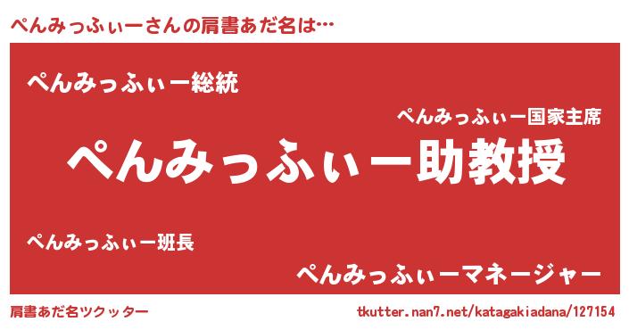 | 男性向けラノベタイトル風あだ名 | 『おまえをオタクにしてやるから、俺をぺんみっふぃーにしてくれ! 』 |