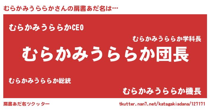 | 男性向けラノベタイトル風あだ名 | 『むらかみうららかの嫁は女の子じゃないと思った?』 |