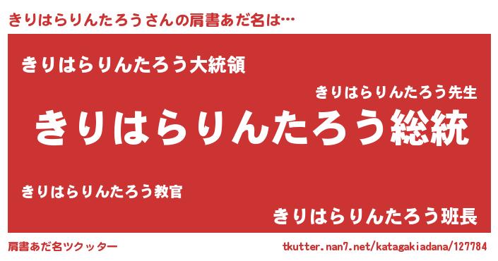 | 男性向けラノベタイトル風あだ名 | 『Re:きりはらりんたろうから始める異世界生活』 |