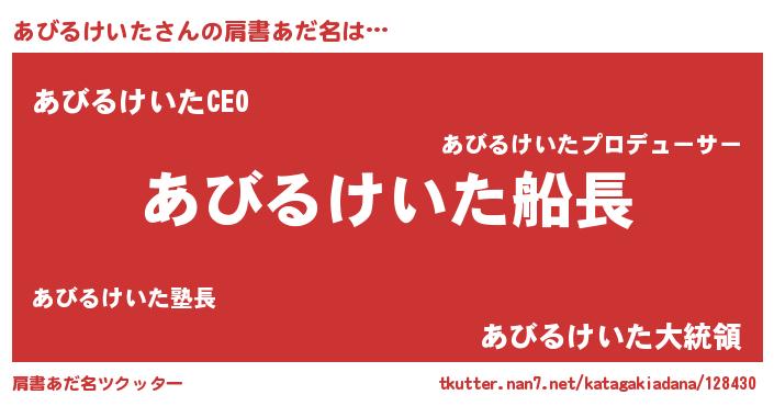 | 男性向けラノベタイトル風あだ名 | 『うちのあびるけいたが世界を掌握している!』 |