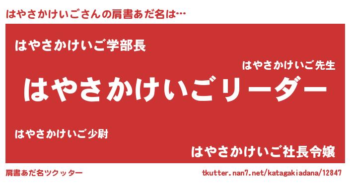 | 男性向けラノベタイトル風あだ名 | 『はやさかけいごの嫁は女の子じゃないと思った?』 |