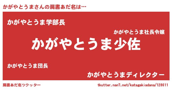 | 男性向けラノベタイトル風あだ名 | 『転生したらかがやとうまだった件』 |