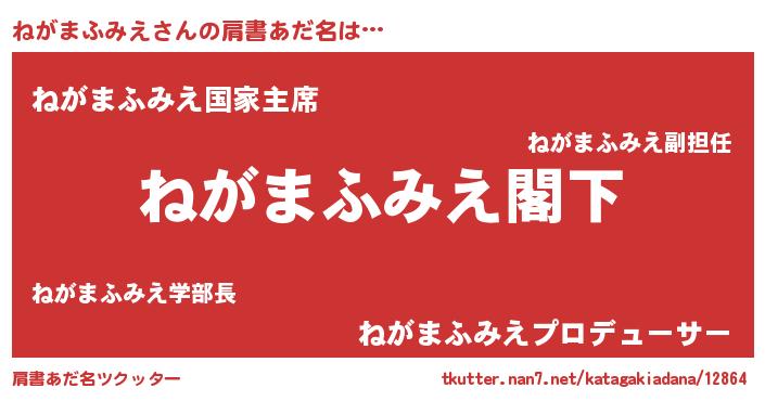 | 男性向けラノベタイトル風あだ名 | 『Re:ねがまふみえから始める異世界生活』 |