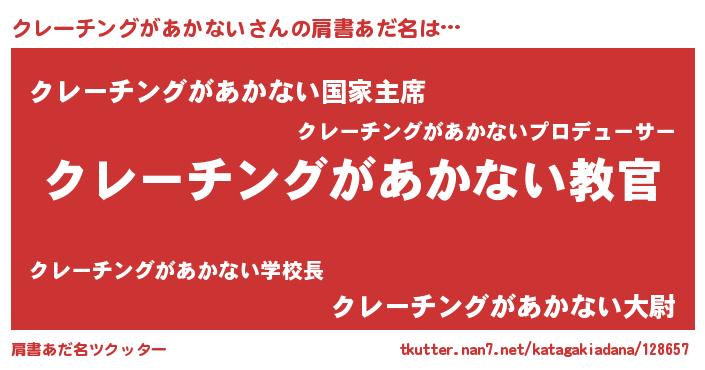 | 意味不明あだ名 | 『住所不定無職クレーチングがあかない(3歳)』 |