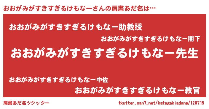 | ヘコむあだ名 | 『おおがみがすきすぎるけもなー(小並感)』 |