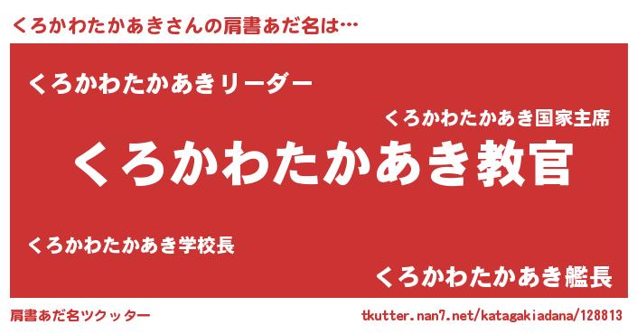 | 男性向けラノベタイトル風あだ名 | 『魔弾の王とくろかわたかあき』 |